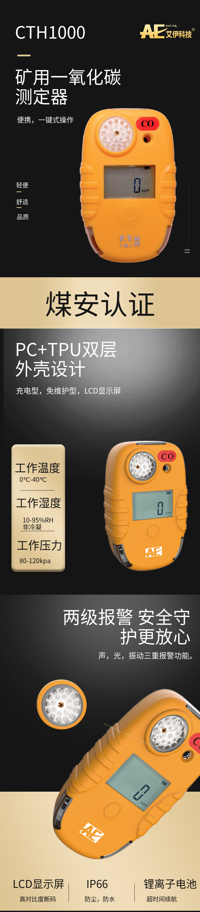 艾伊科技型CTH1000礦用一氧化碳測定器(以下簡稱測定器)適用于煤礦井下作業(yè)環(huán)境中一氧化碳氣體濃度的測量及報警。產(chǎn)品為全握式設(shè)計,體積小巧,內(nèi)置電化學(xué)傳感器,響應(yīng)迅速。已獲得煤安認(rèn)證,CTH1000的防護等級達到IP66,可適用于環(huán)境惡劣場所,雙層設(shè)計的外殼在保證握持手感的同時也能經(jīng)受惡劣環(huán)境的考驗,同時,單鍵操作大大減少誤操作可能。該探測器具有聲,光,振動三重報警功能。測定器具有操作簡單,攜帶方便,準(zhǔn)確可靠等優(yōu)點。